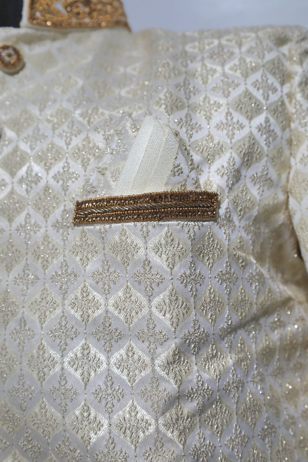 Exclusive White Golden Sherwani, Flawless Embroidery Works with Rose Gold coloured Thread. Attached Pocket Square and Buttons have Premium Beads Work on it. Pure Turkish Premium Crepe Fabric suitable for Summer and Winter Weddings.